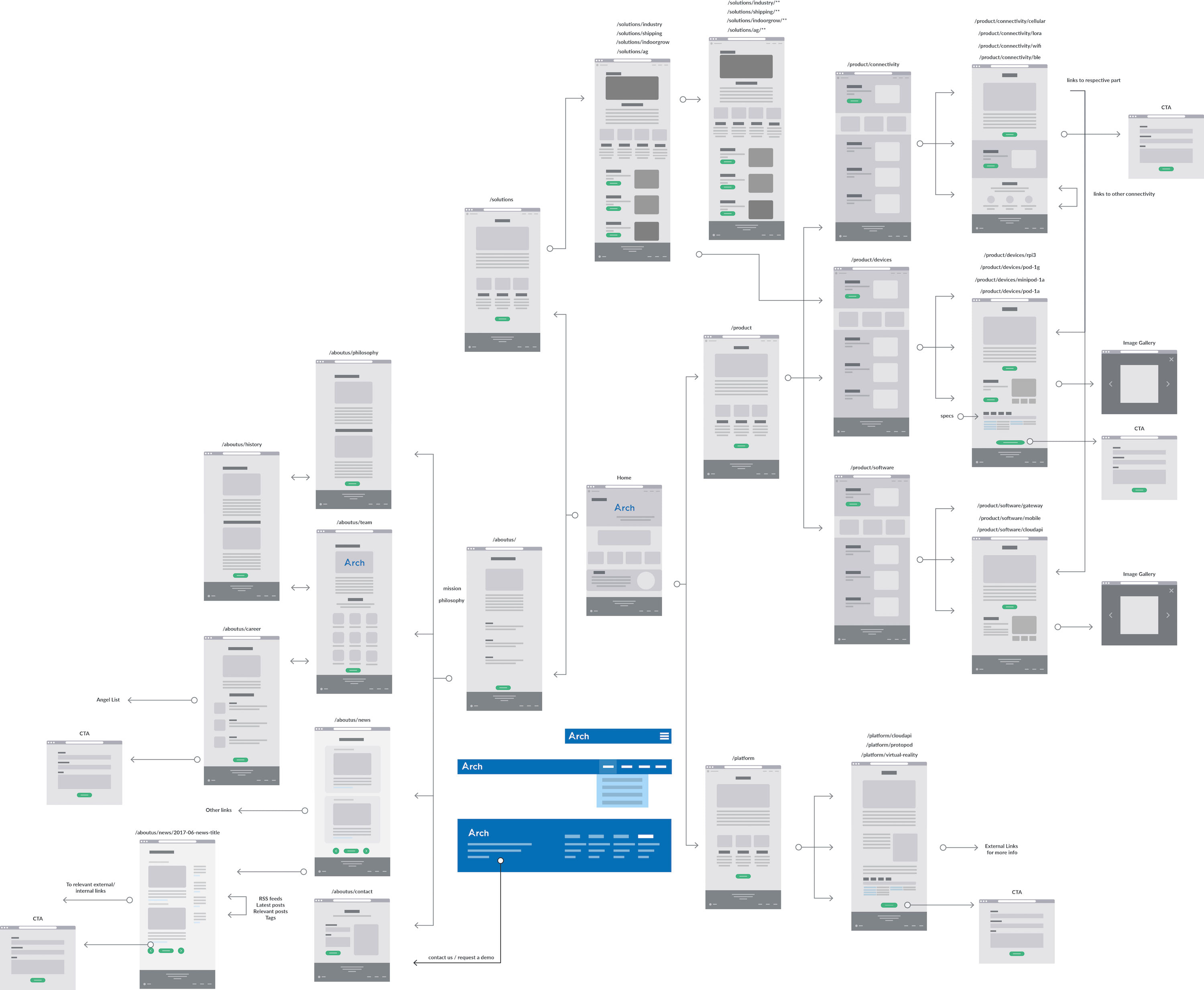 Next, I constructed the information architecture and accessibility of the pages. I started out with low-fidelity sketches and then moved to a medium-fidelity information architecture to visualize the user flow. We prioritized and rolled out the ‘Solutions’ pages first due to implementability and to demonstrate use cases. The 'IOTile/Product' pages were next in line.