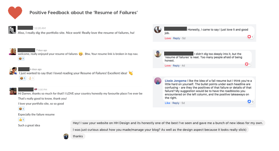 The Resume of Failures was a success with lots of positive feedback saying they liked it a lot! I really appreciate the extremely supportive design community for their help to make this piece possible. (It’s the community that makes learning more accessible from one another.)