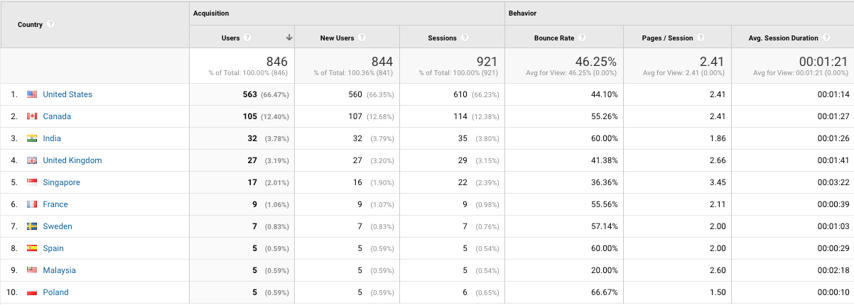 66.47% of visitors from the US, 12.4% from Canada, ~4% from India, ~3% from UK.